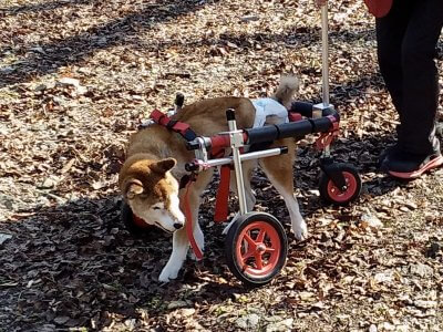 前後の脚に神経系の影響があり、二輪の車椅子では転んでしまうため、三輪車椅子を製作させて頂きました。